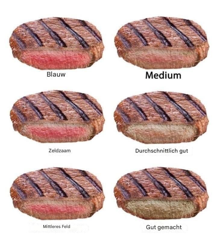Auch bekannt als Very Rare, Blood Rare, Black & Blue, Pittsburgh Rare oder Bloody As Hell. Blue Rare Steaks werden nur außen angebraten, was bedeutet, dass das Innere fast vollständig ungekocht und roh bleibt. Blue Rare Steaks sind innen oft noch kühl und können zum Aufwärmen bei niedriger Temperatur in einen Ofen gestellt werden.