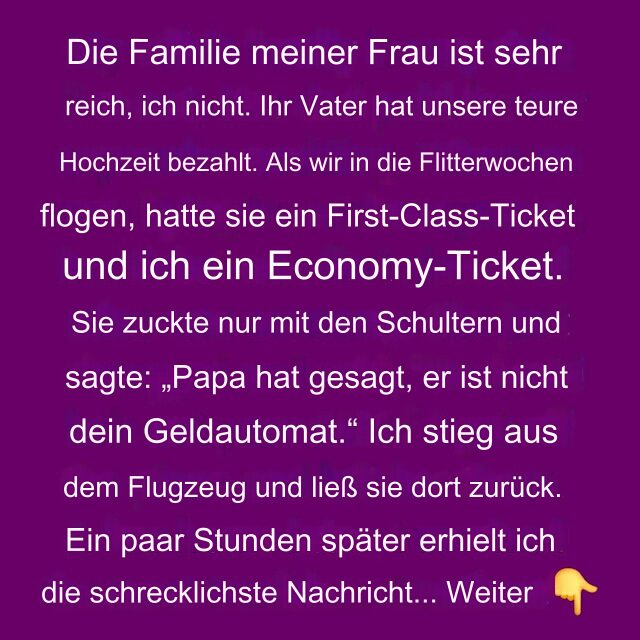 Allerdings haben ihre Eltern unsere Hochzeit bezahlt. Meine Frau flog in der ersten Klasse auf unserer Hochzeitsreise, aber ich konnte mir nur Economy leisten. „Das ist schrecklich, aber Papa sagt, er ist nicht deine Geldmaschine“, bemerkte sie achselzuckend.